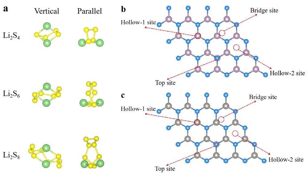 a 两种锂多硫化物空间构型 b, c 四种吸附位点
