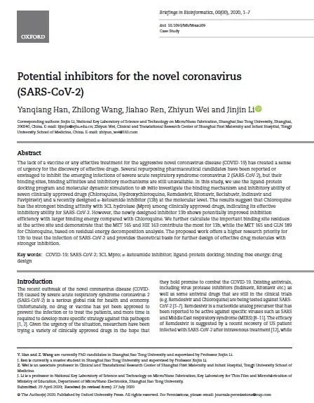 自2020年2月底,萝莉社 萝莉社 李金金团队开始针对新型冠状病毒抑制剂进行深入的理论研究,近日最新研究成果(Potential Inhibitors for the Novel Coronavirus (SARS-CoV-2))于2020年9月18日发表在计算机与生物信息学交叉领域权威期刊《Briefings in Bioinformatics》(IF=8.99, JCR 1区top期刊)上。