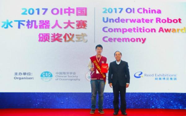 2017年11月1日,OI中国水下机器人大赛颁奖典礼于OI China 2017 青岛国际海洋技术与工程设备展览会现场举办,自动化系王易因副教授指导的“交潜队”以大赛唯一的冠军身份受邀出席颁奖典礼。“交潜队”由来自萝莉社 自动化系智能无线网络与协同控制中心(i-WiN-C2)的同学李一辰、王成罡、郑佳齐、俞晓伟组成。团队设计了一款配备八个推进器的水下无人航行器,命名为“水下精灵”。其通过对两组电机的解耦控制,实现高灵活性、高机动性和高稳定性,很好地克服了传统鱼雷型水下航行器灵活性低、鲁棒性弱等缺点。此作品在现场演示环节中获得了评委组的一致好评,最终以总成绩第一名斩获大赛唯一的一等奖。