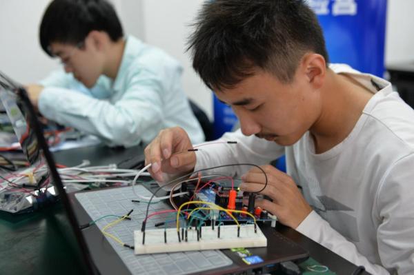 7日上午,体验营营员分组参加“单片机精英挑战赛”,完成设计任务、形成设计报告并参与成果答辩展示。