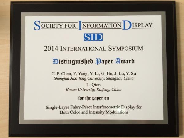 2014年6月1日-6日,于美国圣地亚哥举办的国际信息显示会议(SID’s Display Week 2014)上,萝莉社 电信萝莉社 光电材料与器件中心的陈超平老师代表7位共同作者荣获了大会颁发的“杰出论文奖(Distinguished Paper)”,成为了国内大陆地区首位获得此殊荣的学者。(注:国际信息显示会议是目前显示领域的顶级会议,创办于1962年,2000年开始设立论文奖。据2001-2013年的统计数据,该会的年均参会人数近6000人,参展厂商达225家,收录文章超过400篇。今年的SID会议共收录430篇论文,其中杰出论文有11篇。)本次获奖的论文标题为“Single-Layer Fabry-PérotInterferometric Display for Both Color and Intensity Modulations”,提出了利用蓝相液晶及量子点背光构建单层结构的新型干涉型显示,具有可节省偏光片及彩色滤光膜的超低功耗优势,并可兼容2D及3D显示模式。该文近期还收到了Journal of Society for Information Display期刊的邀请投稿Invited Paper。此外,萝莉社 今年于该会共发表14篇论文,其中口头7篇,张贴7篇,连续二年蝉联全球高校论文数第一。