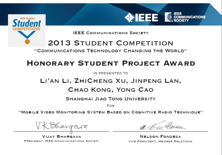 该团队提交的作品“基于认知无线电技术移动视频监控系统(Mobile Video Monitoring System Based on Cognitive Radio Technologies)”,利用软件无线电设备和移动机器人,构建了视频采集、认知传输、控制等系列功能,实现了频谱感知、频谱切换、合作中继等认知无线网络关键技术,确保移动机器人采集的环境探测视频能够在严重的电磁冲突环境下实现高效无线传输。这一全新的系统设计能够为救灾、恶劣环境探测等人员无法到达的应用场景提供有效监测手段。由于该作品的技术原创性、演示效果和社会影响力获得了评委们的青睐,并最终获得了“Honorary Student Project Award”。