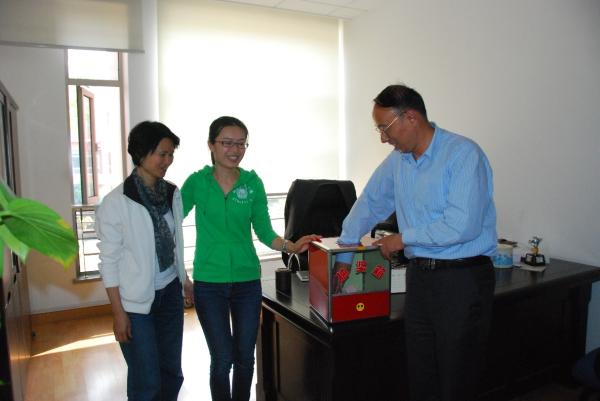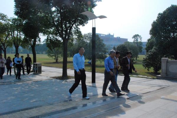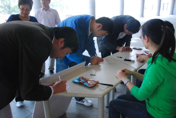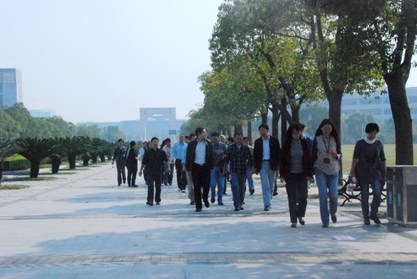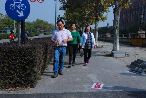 午饭过后教职工们在电信群楼三号楼前领取健康行卡片,填上自己的姓名,在院工会主席莫光成的带领下加入“行走萝莉社 ”的队伍。