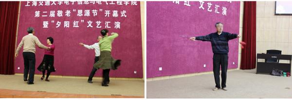 “夕阳红”文艺汇演主要是离退休老师的才艺展示。优美的交谊舞,声情并茂的独唱,娴熟的空竹表演,多种形式的文艺演出展示了退休教职工丰富多彩的老年生活,体现了他们“老当益壮”的胸怀。学生代表演唱的《落叶归根》,在职教师的合唱更是表达了年轻一代对老一辈的尊敬和感激。