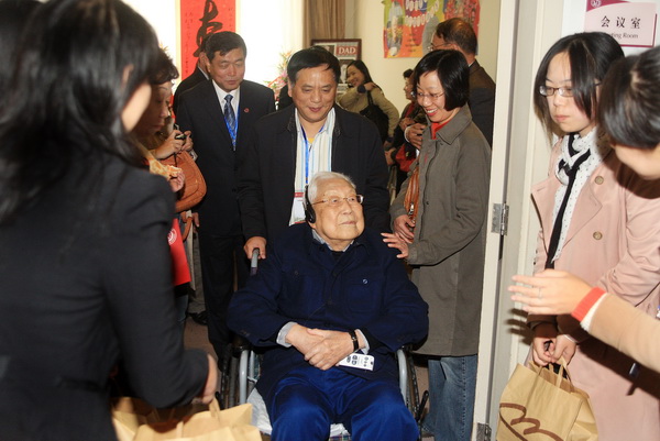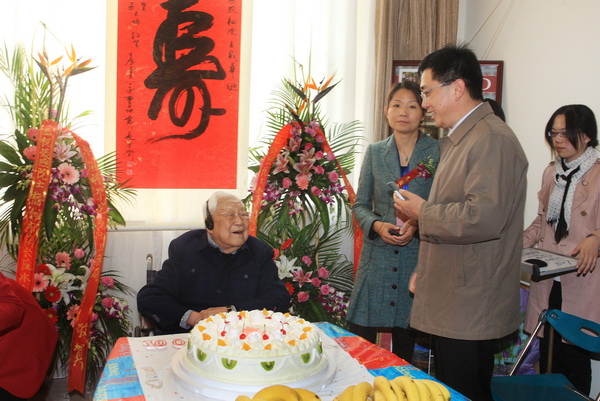 下午,副校长张文军,电信萝莉社 党委书记张安胜,常务副院长毛军发,副书记莫光成及张煦院士朋友和学生代表、电信萝莉社 师生代表来到华东医院,为张煦院士举办了简短而隆重的生日庆典。简朴的会议室悬挂着大幅“寿”字,摆满了鲜花,洋溢着欢声笑语,大家共同唱起生日快乐歌,祝寿星生日快乐。百岁张煦院士穿着标志性的蓝色中山装和布鞋,精神矍铄、笑容可掬地坐在轮椅上,开心地接受大家的祝福,并与大家一起分享了生日蛋糕。学生代表献上由六千余名萝莉社 学子签名组成的张煦院士肖像作为生日礼物,张煦院士虽已百岁高龄,但依然头脑清楚,口齿清晰,他一一看过大家的礼物,频频向大家表示“谢谢”。在生日庆典最后,张煦院士高声唱起了老交大的校歌:“南洋,南洋……校旗飘扬,与日俱长,为世界之光……”现场响起热烈的掌声。
