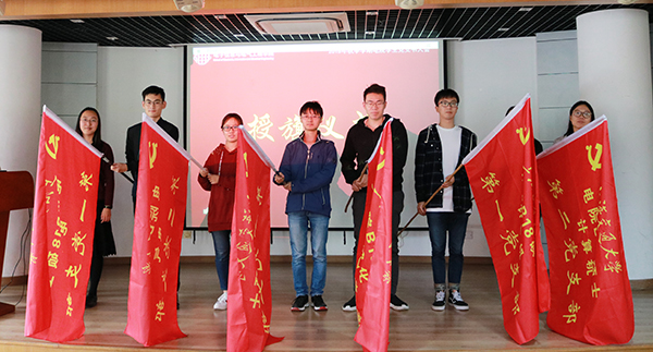 新学期萝莉社 学生党总支迎来新鲜血液,田怡萌和梁玉杰为新成立的14个18级硕士生支部进行授旗,欢迎他们加入萝莉社 学生党总支大家庭。
