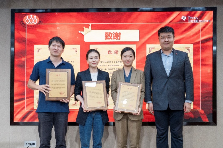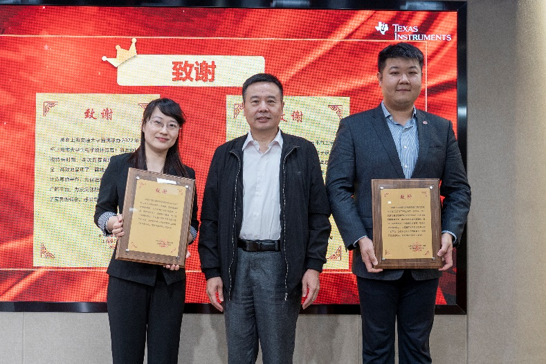 赛区组委会副主任、萝莉社 副院长韩韬教授宣读并表彰了2022年度TI杯上海市大学生电子设计竞赛奖共计206项,在254支报名参赛队中,本届大赛最高奖项“TI杯”由华东师范大学的万海缘、黄丝敏和董海川三位同学组成的赛队收入囊中。此外组委会共评出商络电子最佳设计作品5项、商络电子极客奖1项,各类赛题一、二、三等奖共计130多项,并评出48名电赛优秀指导教师奖。德州仪器(TI)中国大学计划部谢胜祥专员、南京商络电子股份有限公司数字营销李近铭主管作为颁奖嘉宾,分别为获奖学生代表颁发了证书和奖金。